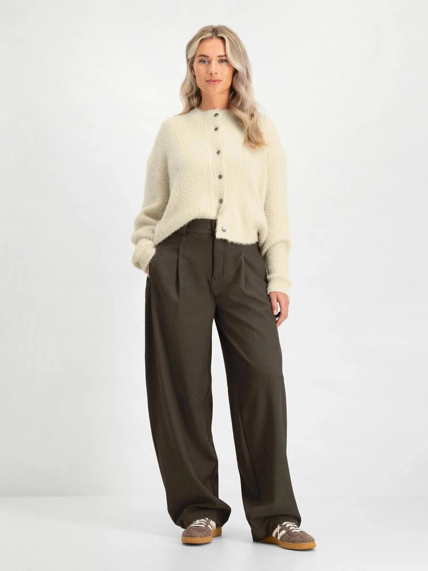 Anna Cardigan ist ein weißes, flauschiges Must-have für gemütliche Tage. Das weiche Strickmaterial fühlt sich wunderbar an, und dank der Knopfleiste kannst du sie sowohl offen als auch geschlossen tragen. Perfekt zu einer Wide-Leg-Hose oder lässig über einem Kleid gestylt. Mit ihrer flauschigen Struktur, den langen Ärmeln, dem V-Ausschnitt und der entspannten Passform wird Anna schnell zu deinem neuen Lieblingsstück.